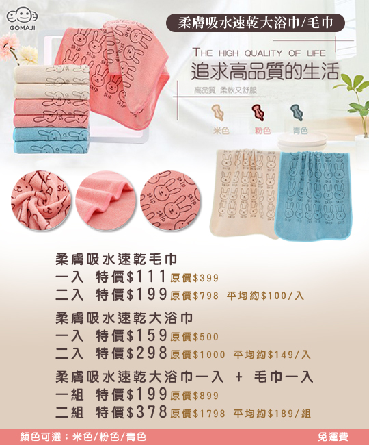 【柔膚吸水速乾毛巾/大浴巾】厚實柔軟,超細纖維吸水有一套,當BABY浴巾、洗臉、乾髮都好用喔!只要111元起,即可享有柔膚吸水速乾毛巾/大浴巾等組合,顏色可選:米色/粉色/青色