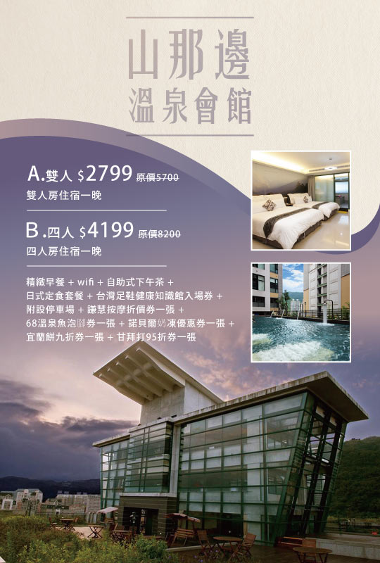 只要2799元起,即可享有【宜蘭礁溪-山那邊溫泉會館】一泊三食住宿方案A.雙人/B.四人〈含A.雙人房 / B.四人房住宿一晚 + 精緻早餐 + wifi + 自助式下午茶 + 日式定食套餐 + 台灣足鞋健康知識館入場券 + 附設停車場 + 謙慧按摩折價券一張 + 68溫泉魚泡腳券一張 + 諾貝爾奶凍優惠券一張 + 宜蘭餅九折券一張 + 甘拜打95折券一張〉